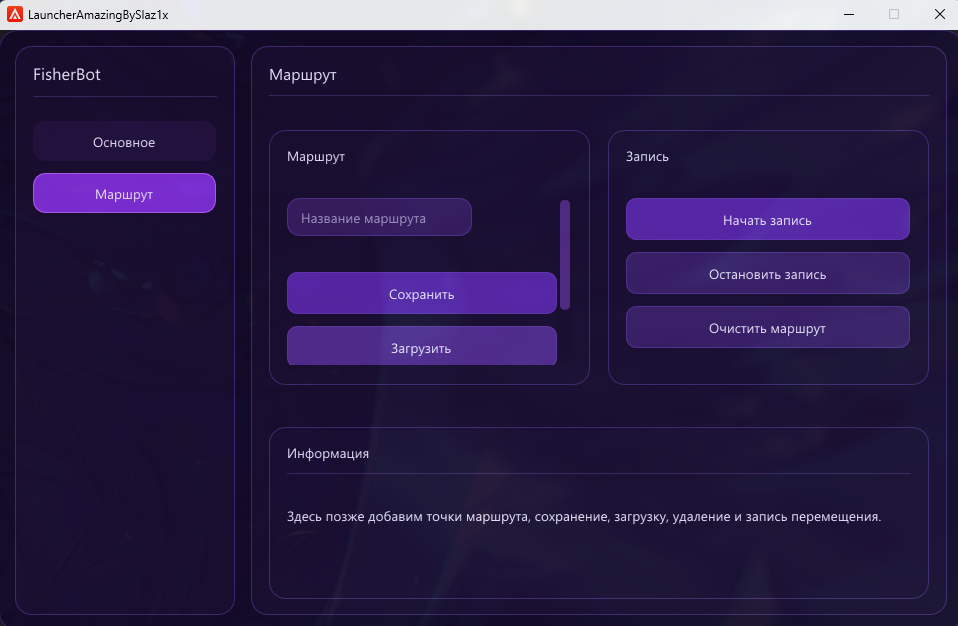 FisherBot — бот для автоматизации рыбалки. Подходит для долгой работы, рутинного фарма и удобного запуска. Маршрут пока в стадии разработки.